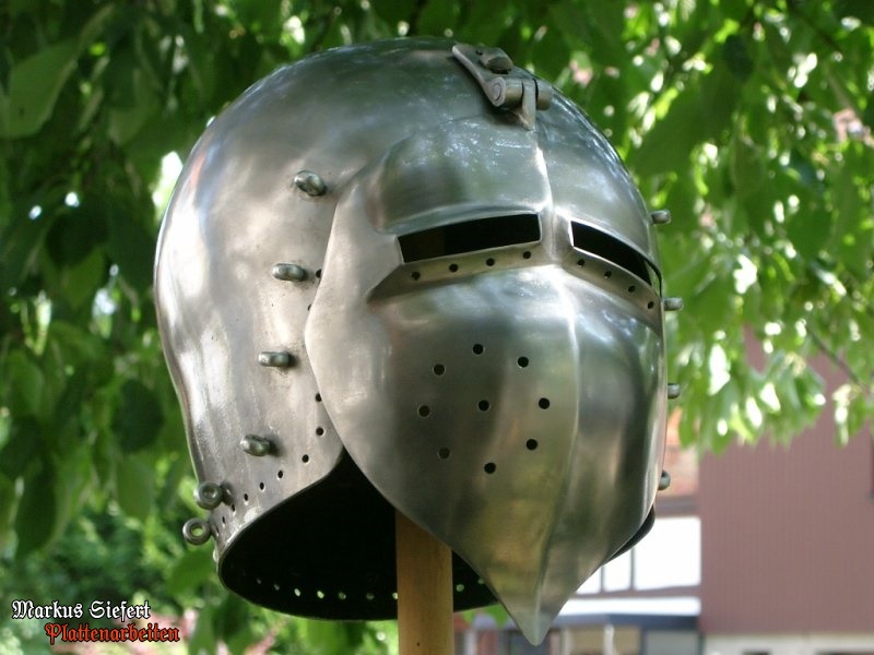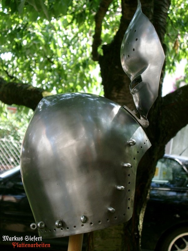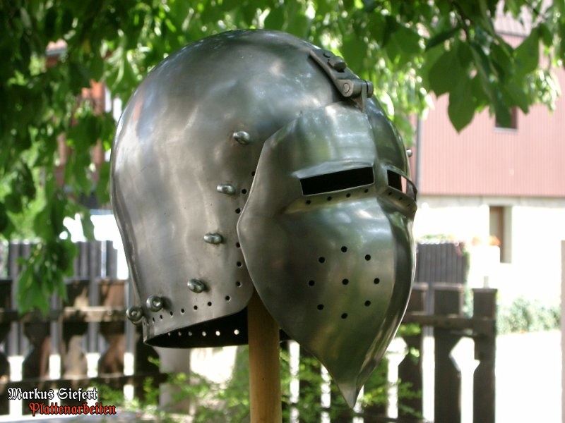 Abnehmbares Visier, umlaufende Kloben zur Befestigung der Helmbrünne aus Kettengeflecht