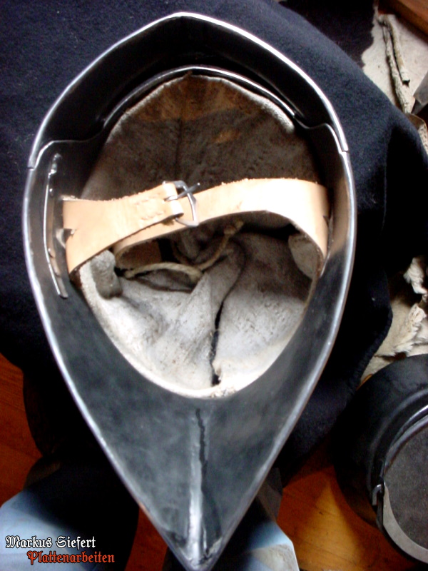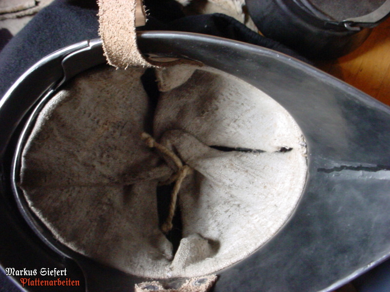 Einfache knechtische Hirnhaube mit Kinnriemen aus Leder und handgenähtem Innenfutter aus Leinen.