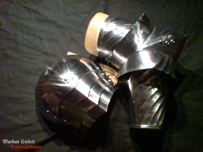 Nochmals der gleiche Harnisch mit Wechselarmzeug und kleineren Wechselschultern; diese ermöglichen ein historisch korrekteres Erscheinungsbild.
