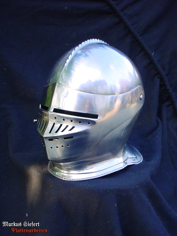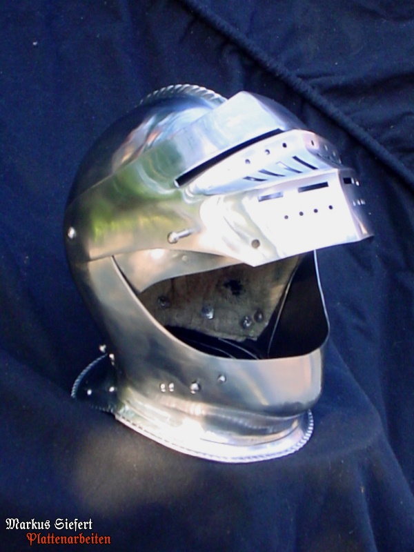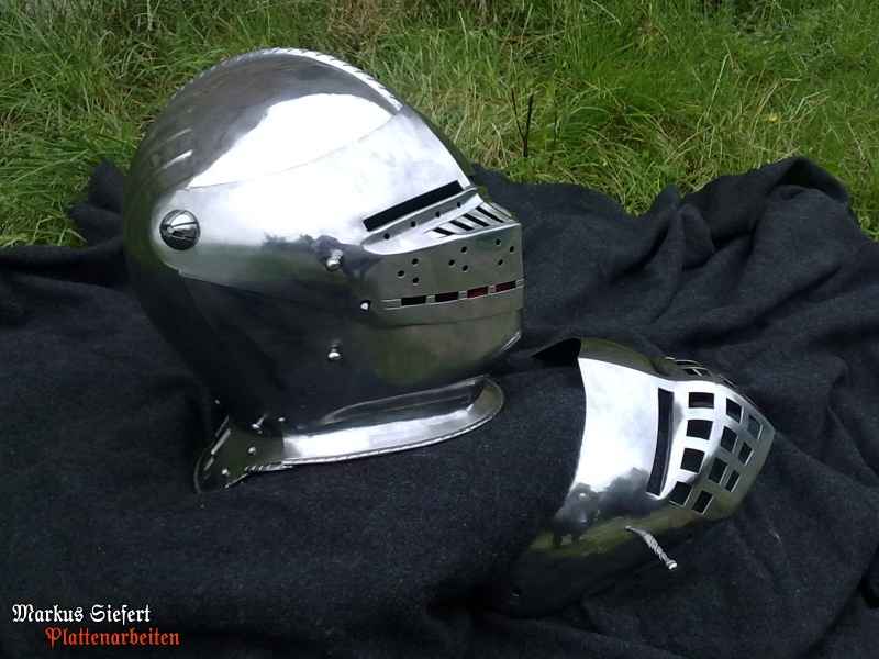 Sog. deutscher Visierhelm mit Kielvisier. Im Wulst umgehendes Armzeug mit großen Schultern,